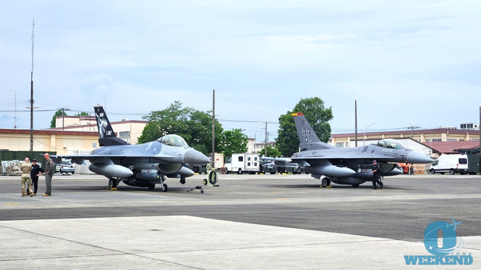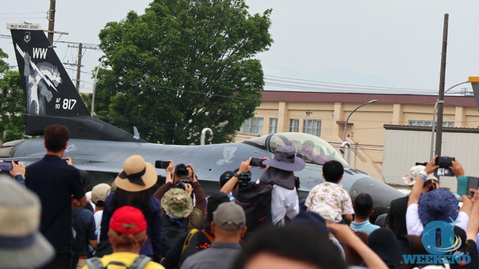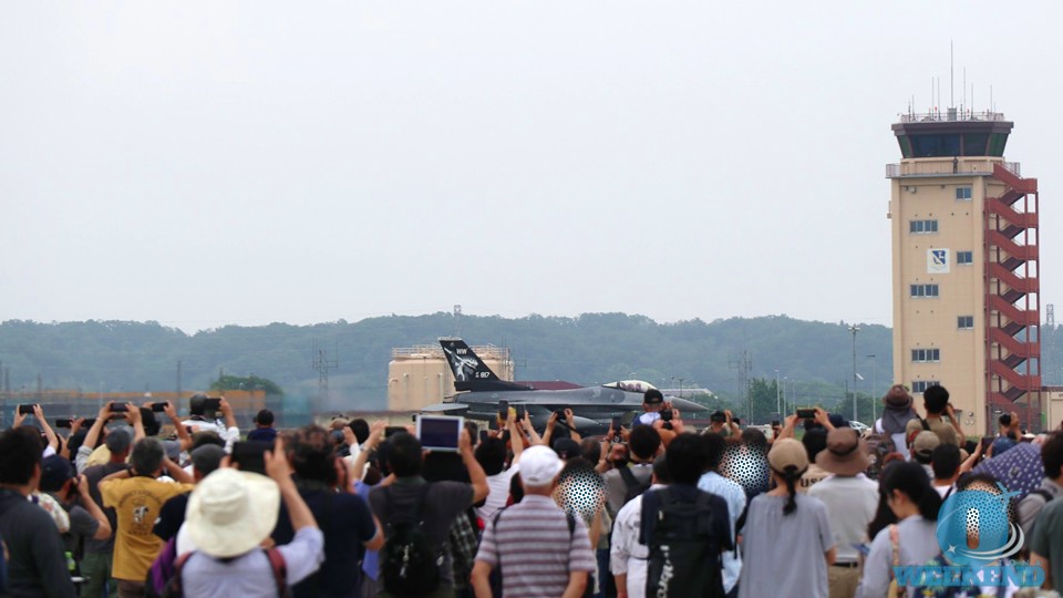 F-16の2機が滑走路に向かってタキシング開始。アナウンスが入るので見逃すことはないでしょう。