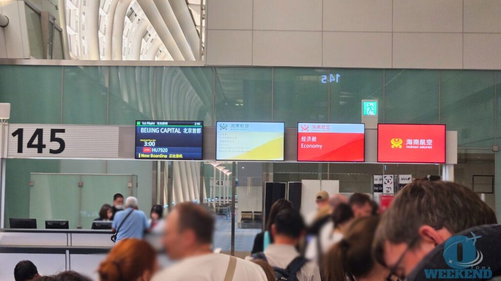欧米系の人たちが並んでいる列は明らかに乗り継ぎ便っぽいので、私は北京行きへ。30分くらい並びました。