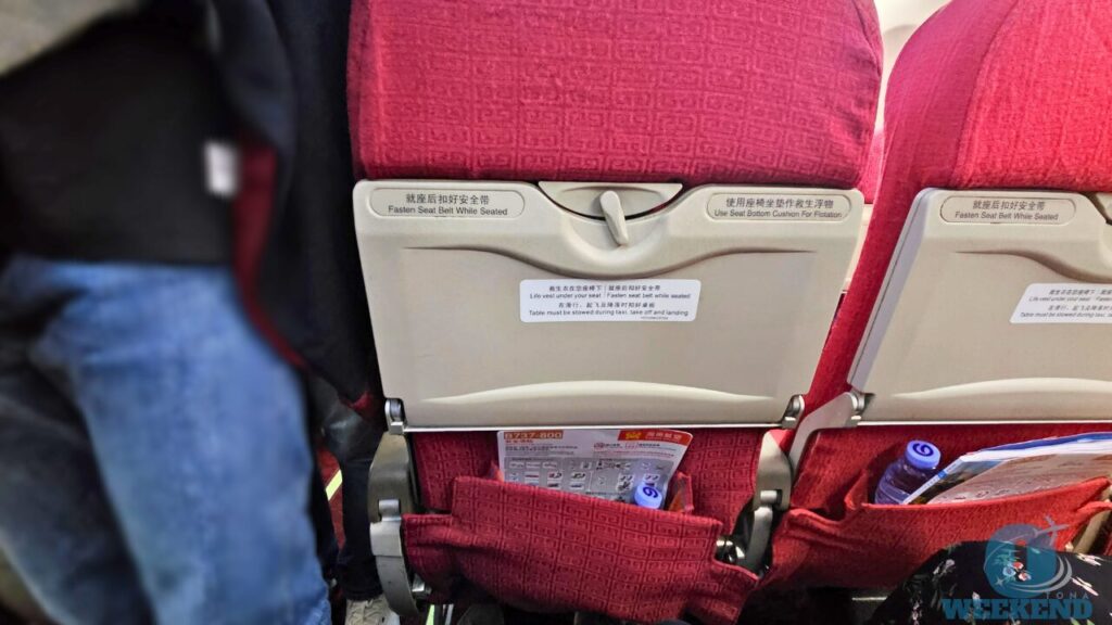 今回の機材は B737-800。ちょっと古めですが、水のペットボトルが席に置いてあるのはありがたいポイント。