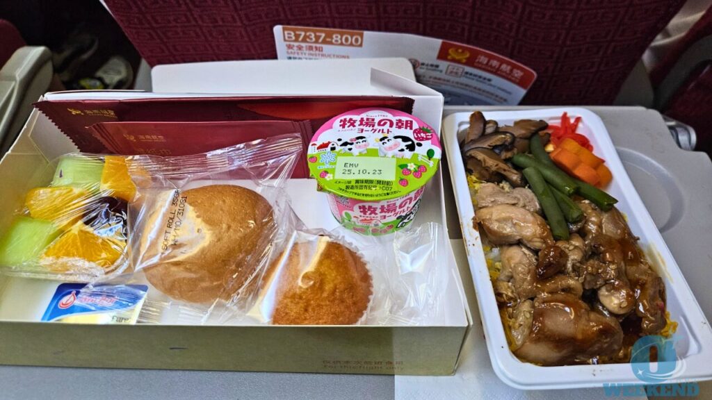 深夜なのにしっかり機内食が出てきます。2種類から選べて、正直「この時間に食べられるのか…?」と思っていたけれど、案外食べられました。