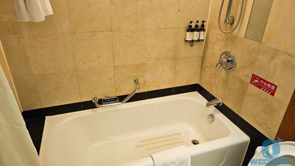 浴槽もあり。お湯はすぐ出るタイプなのでありがたいです。
