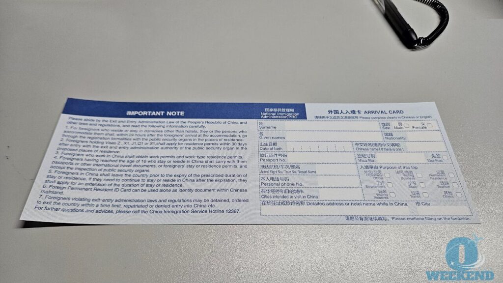 その後は紙の入国カードを書きます。中国はデジタル化がかなり進んでいる割に、ここは紙なんだ…と軽く驚きました。