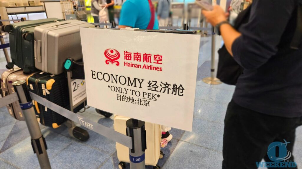 カウンターオープンに合わせて行列に並び始めると、列がちょっとクセあり。ビジネスクラス・北京行き・乗り継ぎ便で3つに分かれていて、わかりづらい。