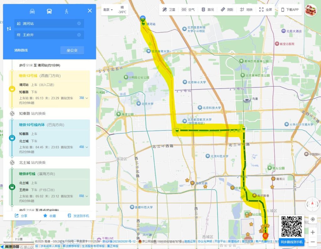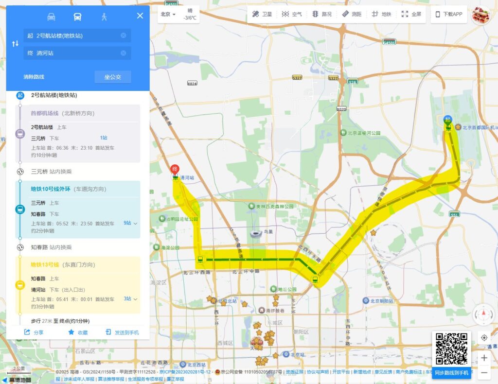 北京首都空港T2から清河駅までは高徳地図で調べて、2回乗り換えで約1時間かかります。