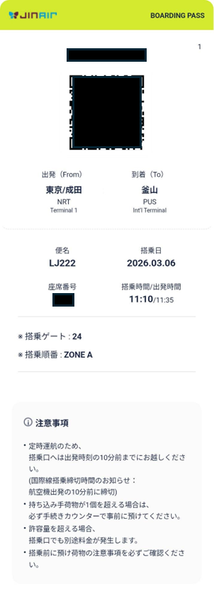 今回はジンエアーLJ222便で成田から釜山へ向かった搭乗レポートです。