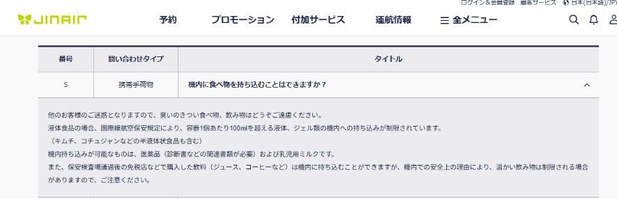 ジンエアー公式ホームページで食べ物の持ち込みは可能なことは確認しています。キムチの注意書きはさすが。