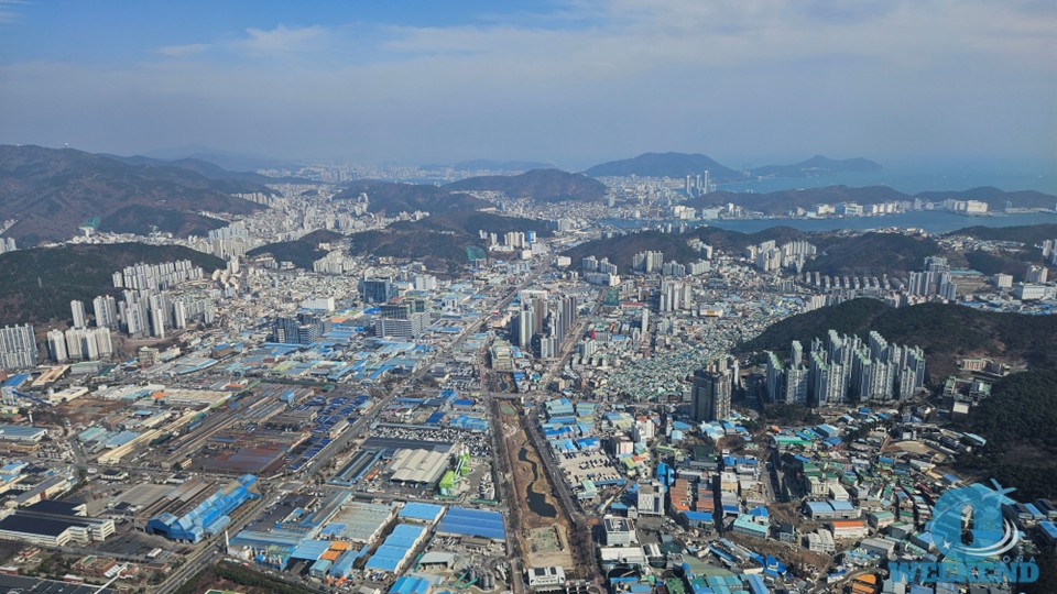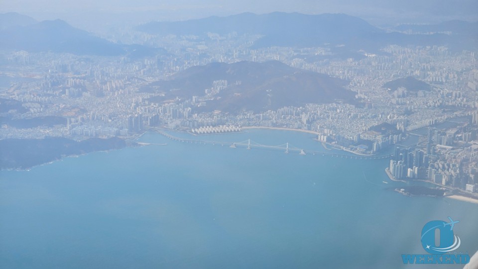 釜山に近づくと海岸線や住宅地が見えてきます。